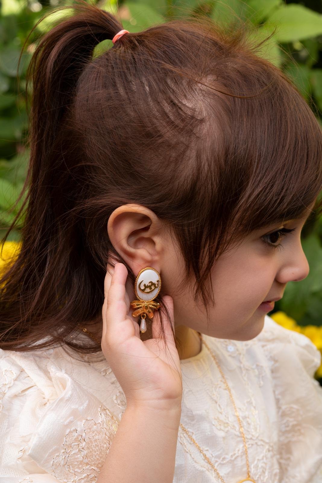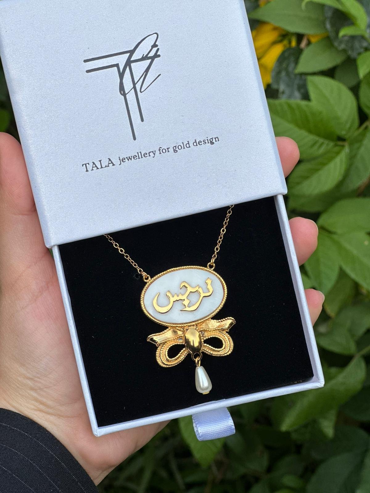 يتميز بقلادة مع حلق متناسق بتصميم بيضاوي أنيق يتوسطه الاسم المخصص، مزين بفيونكة ذهبية ناعمة تتدلى منها لؤلؤة أنيقة تضيف لمسة أنثوية ساحرة.