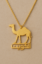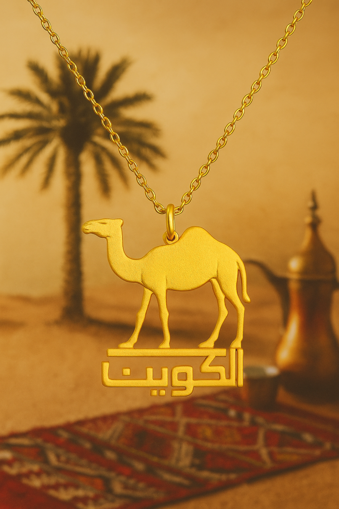 ميدالية ذهبية فاخرة بتصميم الجمل، رمز الأصالة والترحال، منقوش أسفلها كلمة كويت بالخط الكوفي التربيعي.