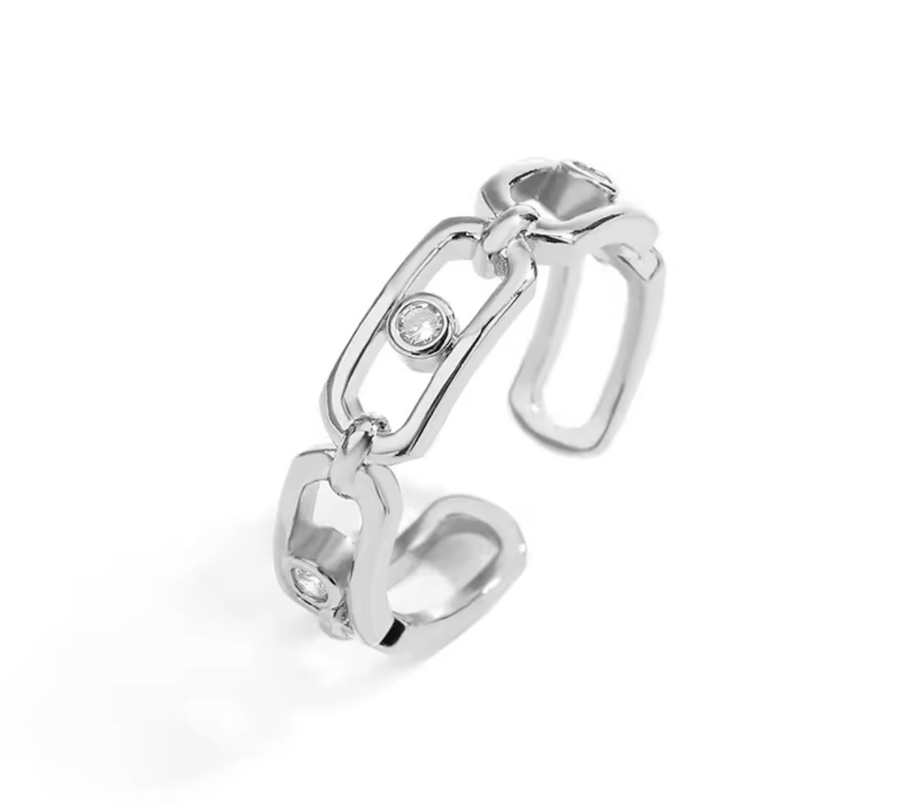 خاتم أنيق بتصميم سلسلة هندسية عصرية، مصنوع من فضة عالية الجودة ومطلية بطبقة فاخرة من الذهب الأبيض ليمنحك لمعان يدوم لفترة أطول.